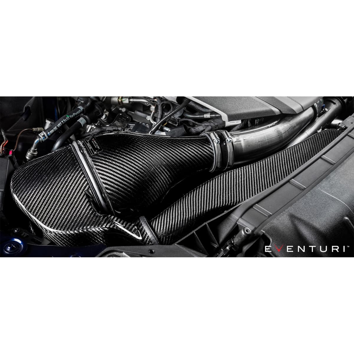 Audi B9 RS4/RS5 Eventuri‑intaget utvecklades för att ge mindre restriktiv luftflöde till turbon samtidigt som intagstemperaturerna hålls låga. RS5/RS4 motorutrymmet blir väldigt varmt snabbt, så att bara ha ett öppet konfilter skulle ge bättre luftflöde, men med högre intagstemperaturer. Vi har därför fullständigt omarbetat inloppsbanan från turbo‑inloppsröret till frontgrillen med ett mycket effektivt förseglat system. Den restriktiva original luftboxen och det flexibla plastinloppsröret har ersatts med ett Venturi filterhus och ett kanalsystem med mjuka övergångar. Vidare, genom att ta bort det komplexa originalinloppsröret och ersätta det med vårt en‑delade Venturi hus och solidt rör, blir luftflödet mycket jämnare när det går in i turbo‑inloppsröret. De resulterande prestandavinsterna och estetiken är branschledande för denna plattform.