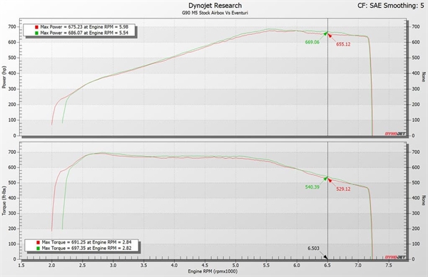 Detta insug har oberoende dynotestats av MSL Performance. Tester utfördes direkt mot original luftburk, och flera mätningar togs för varje konfiguration. Vi använde de bästa resultaten från originalsystemet och de bästa från Eventuri-systemet. Dynotesterna visar en jämn effektökning genom hela varvtalsregistret, vilket kan tillskrivas att turbosystemet når maxtryck tidigare och med lägre wastegate duty cycle tack vare insugets höga effektivitet. Denna vinst uppnåddes trots att dynocellens temperaturer var högre under Eventuri-testerna. Prestationsökningen känns tydligt på vägen med förbättrat gasrespons vid både delgas och fullgas, och bilen drar mycket mer villigt hela vägen till rödstrecket.
