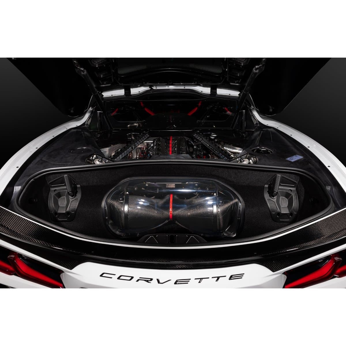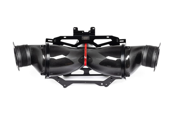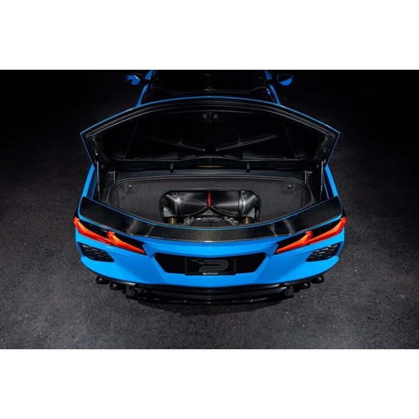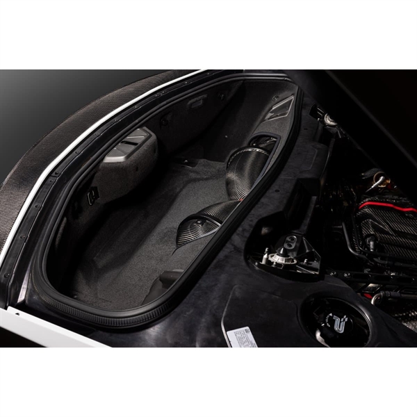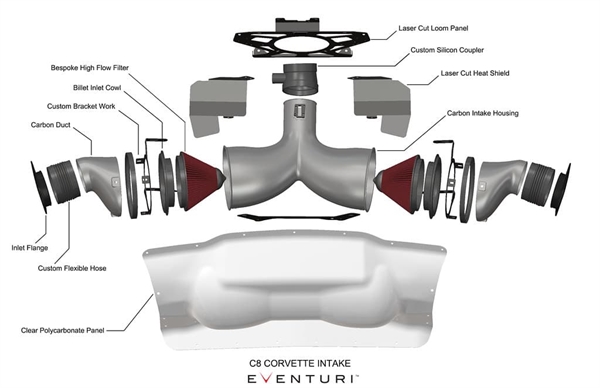 C8 Corvette Eventuri insug sätter en ny standard på denna plattform för den högst presterande insugningen och den största interna volymen som finns tillgänglig*. Med insugningens storlek och form begränsad av OEM bagageutrymmets panel, har vi designat om den för att tillåta en större insugning. I processen har vi också tillverkat den av klar polykarbonat för att visa kolfiberinsugningen när bagageutrymmet är öppet. Genom att använda vårt patenterade Venturi Housing-koncept kan luftflödet passera filtren via en mycket mindre krånglig väg vilket minskar systemets motstånd. Vidare, genom att öka det totala volymen i insugningen, har även flödeskapaciteten ökat vilket möjliggör för högpresterande motorer att maximera effektökningar. Insugningsluftens temperaturer har minimerats genom att säkerställa ett förseglat system, utnyttja OEM luftintag samt använda kolfiber med låg termisk ledningsförmåga genom väggens tjocklek. Resultatet är ett system som levererar ledande prestandavinster och märkbar förbättring i gasrespons.