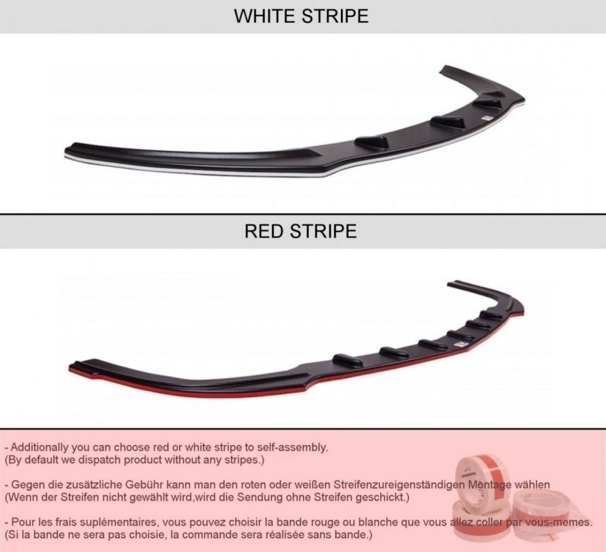 This front splitter for Alfa Romeo Mito is a very good and quick way to spice up your car’s visuals. The part optically lowers suspension giving the car a racing look. Another of its advantages is the improvement to traction and stability of the vehicle. While high-speed driving this upgrade can be especially notable. To customize your look you can pick one of the 3 surface finishes available for the splitter. These looks are: textured, carbon, and gloss. Additionally, you can get a white or red stripe for your splitter.
