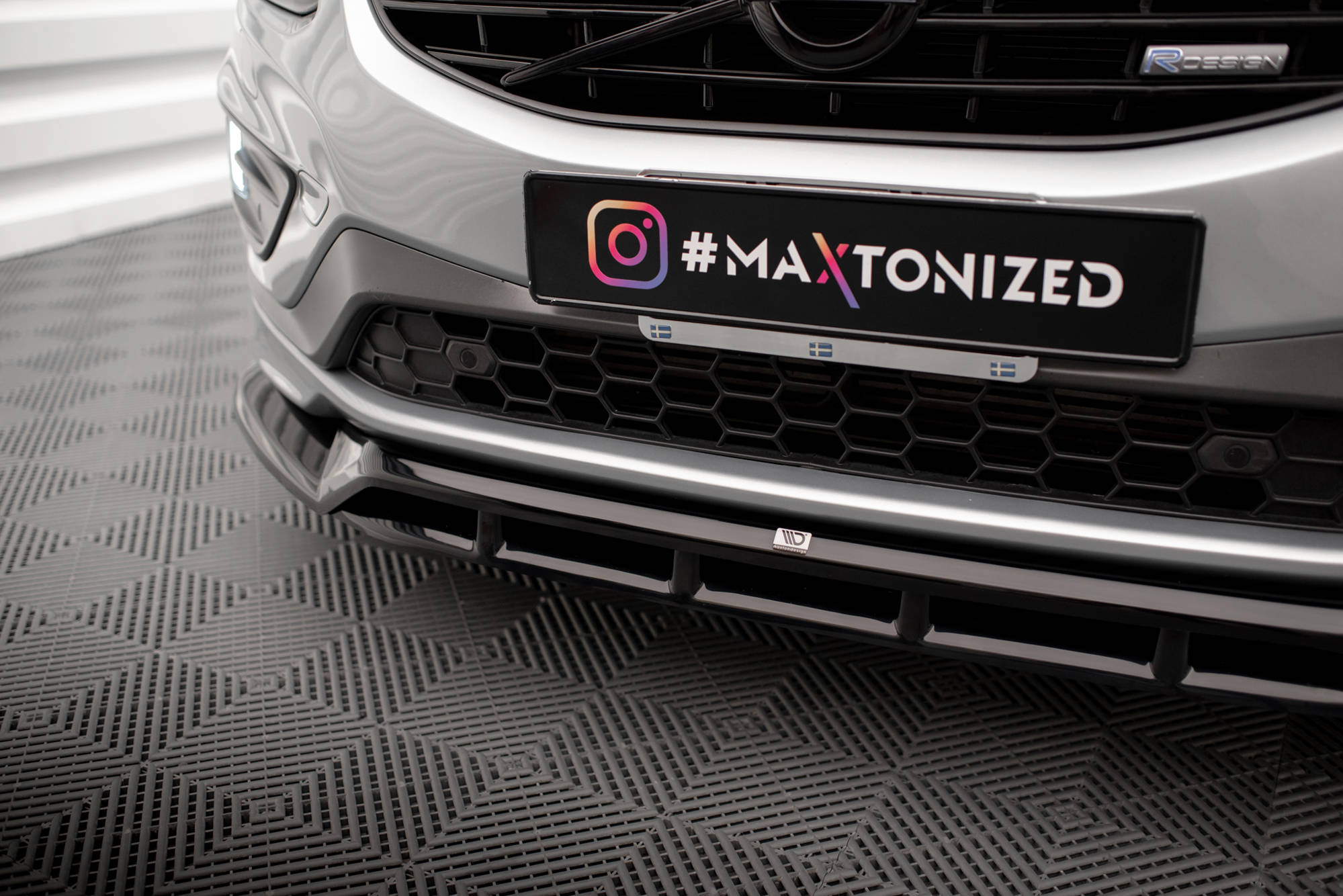 The front splitter installed in the Volvo XC60 R-Design Mk1 Facelift will make the front axle of the vehicle more pressed, making an improvement of the stability and grip of the vehicle. Adding a front splitter to the vehicle will be especially felt durring fast driving. A neat tuning element will optically lower the height of the vehicle body, thanks to which the car will gain a sporty appearance and a modern character that will distinguish it from other cars on the street. The front splitter  is available in three options of surface structure finishing: textured, glossy or imitating carbon. In addition at the manufacturer of Maxton Design can buy decorative tape in white or red.