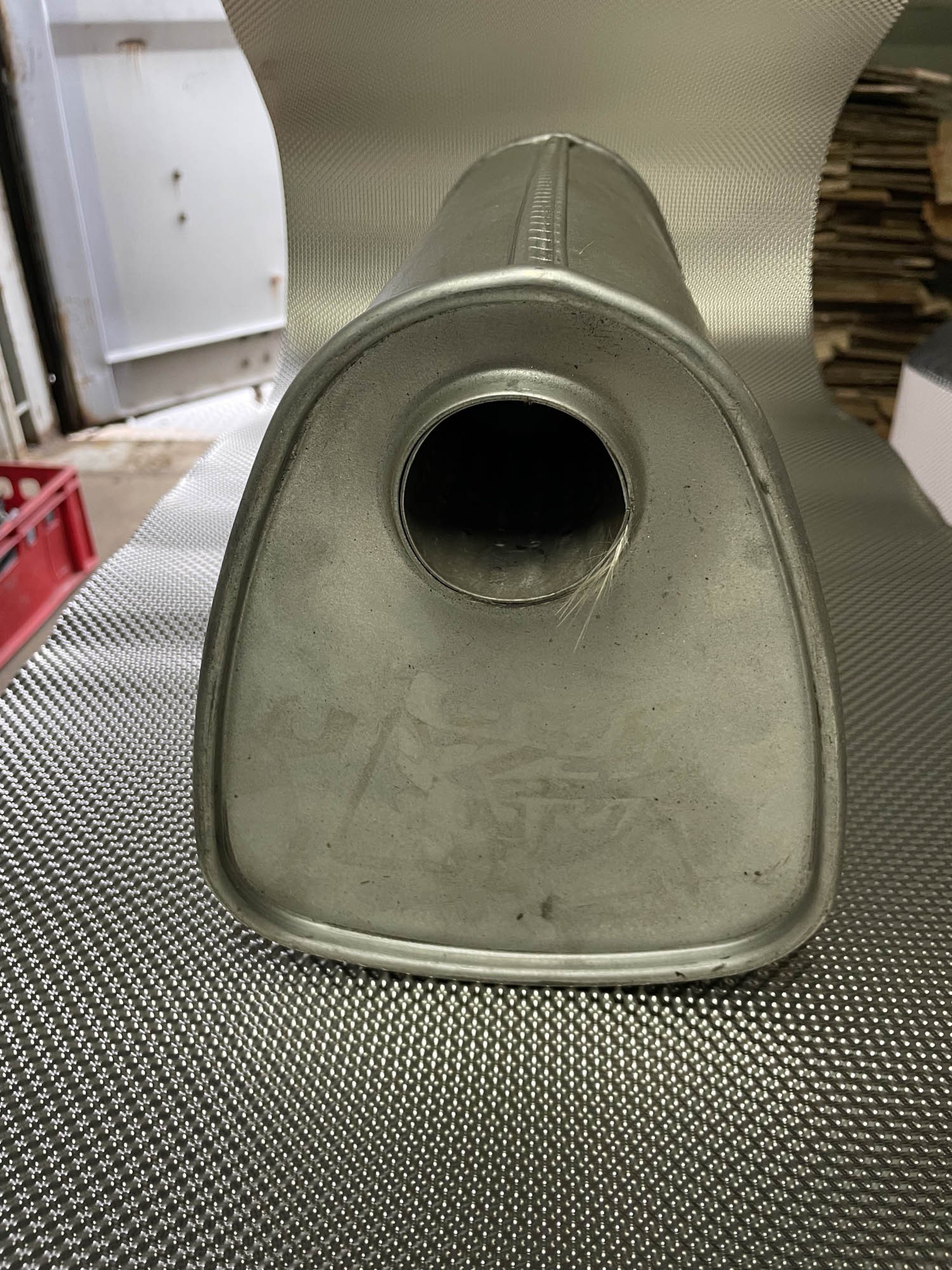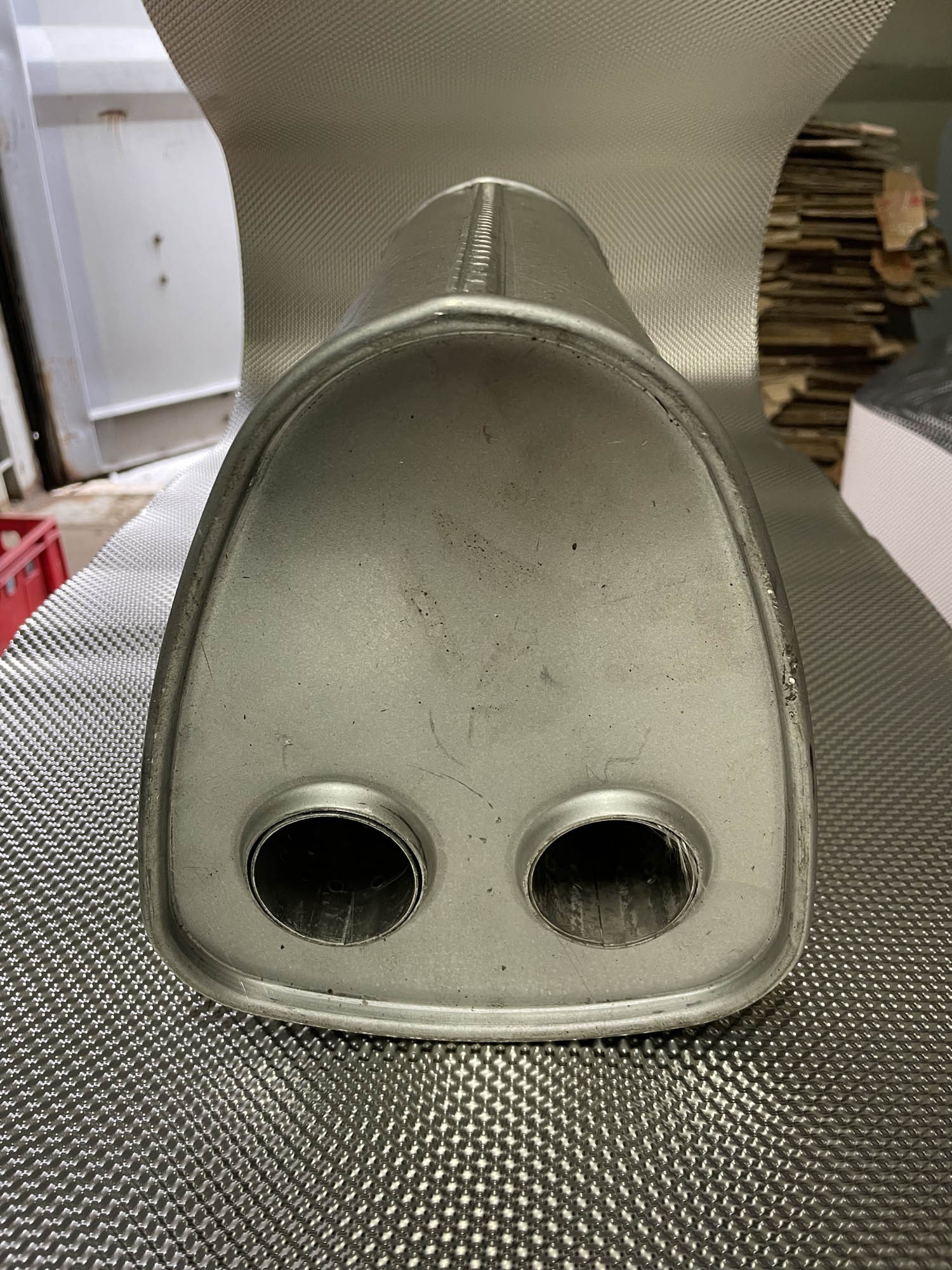 Weldable mounting muffler made of stainless steel.