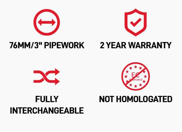 Detta exossystem är inte resonatorerat, vilket betyder att det kommer utan en centralsilencer. Att ta bort den ursprungliga silencern resulterar i ett högre ljud.