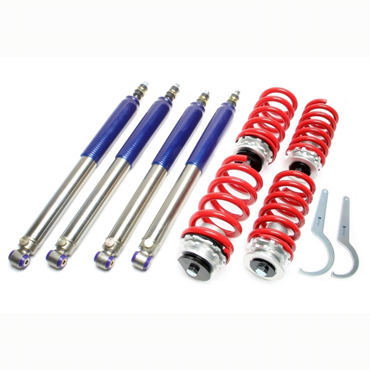 TA-Technix Coilover med höjdjustering. Coiloverkits från TA-Technix är kvalitet för låga priser. TA-Technix Coiloverkits är justerbar från cirka 30 mm-90mm (TÜV / garanterar upp till - 70 mm) - Det kan variate från modell till modell. Observera att inte alla Coilover kit har en TÜV-godkännande, läsa beskrivningen om du har några tvivel. Det är en 2-års garanti på alla TA-Technix Coilover kit.