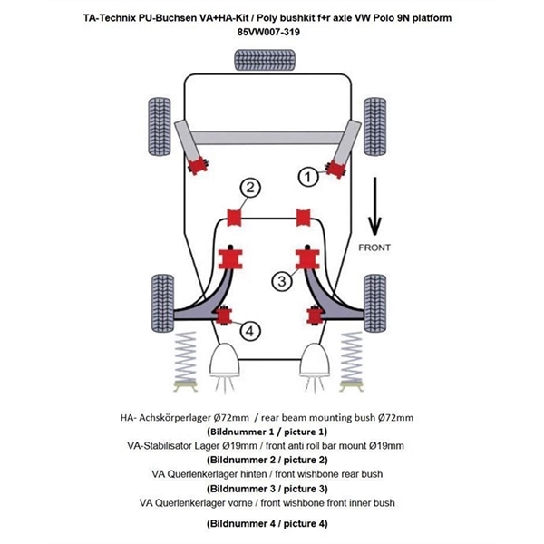 9N-9Y035 000 eller 9N-9B031 000 / 9N-9U022 150 TA-Technix Polyurethan Bøsning Kit til Seat Cordoba. Polyurethan-bøsninger er et alternativ til udskiftning eller opgradering af bøsningerne i din bil. Du får en bedre holdbarhed end standard gummibøsninger og en bedre performance til din bil. Om TA Technix TA Technix er en tysk tuningspecialist, med base i Berlin, som har mere end 10 års erfaring fra tuningbranchen. TA Technix er særligt kendt for deres lave priser og den sporty stil, som de er i stand til at tilføre enhver bil. Sortimentet fra TA er kæmpestort og tæller, foruden sportsundervogne – som den du kigger på nu til Alfa 1300 – også stabilisatorstænger, gevindundervogne, tårnstivere og sænkningsfjedre. Passer også til Seat Cordoba