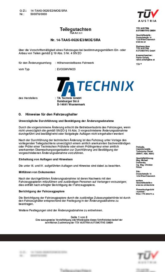 När du sänker din bil, antingen med sänkfjädrar, coilovers eller sportunderstell från TA-Technix, måste uppsättningen du monterar på din bil vara TÜV-godkänd. En TÜV-godkännande är din garanti för att uppsättningen du monterar på din bil har klarat TÜVs stränga teststandarder som är fastställda för hela EU.
